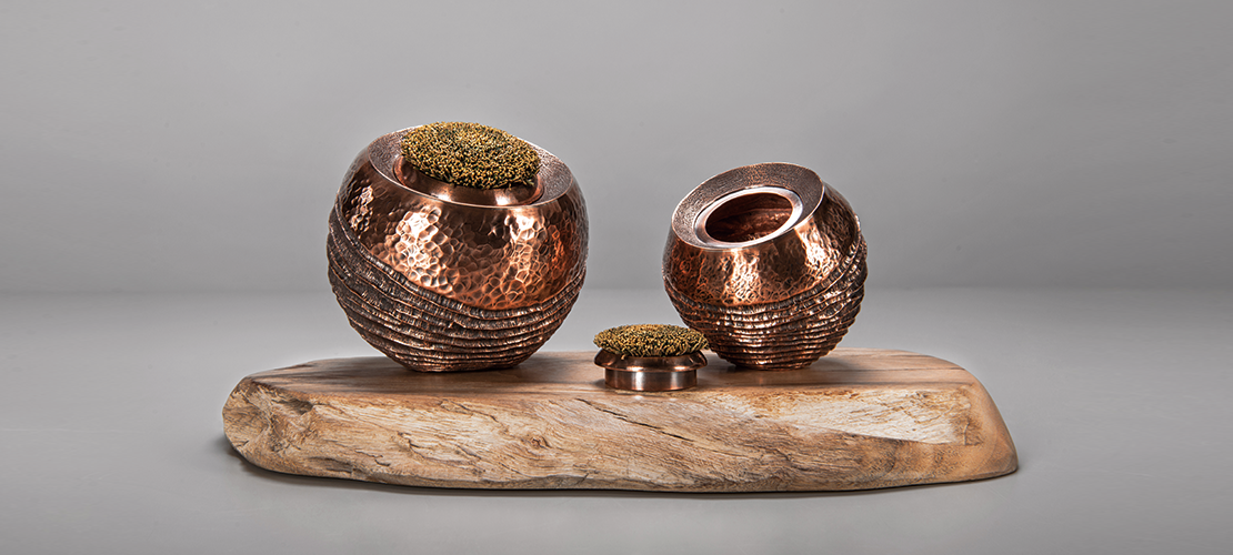 以金屬鍛敲與敲花技法塑造出對種子的幻想,融入植物鞣牛皮營造出生命的起點。