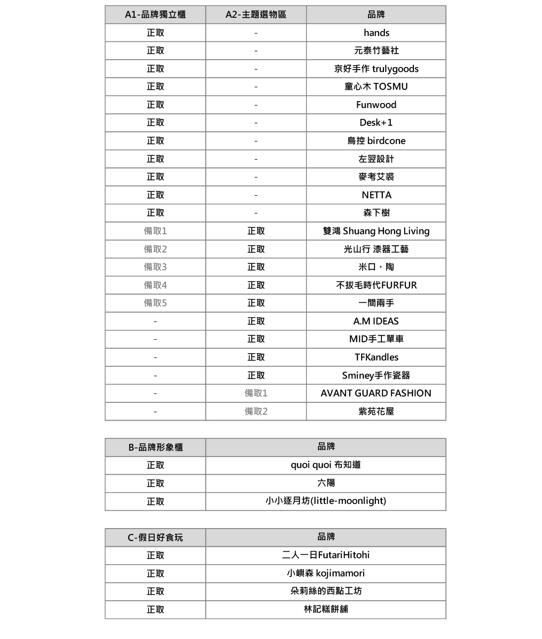 2. 凡入選正取品牌將享有優先參展權(9/16前繳費確認參展),備取通知作業預計於9/21-9/25期間由主辦方主動電話通知。