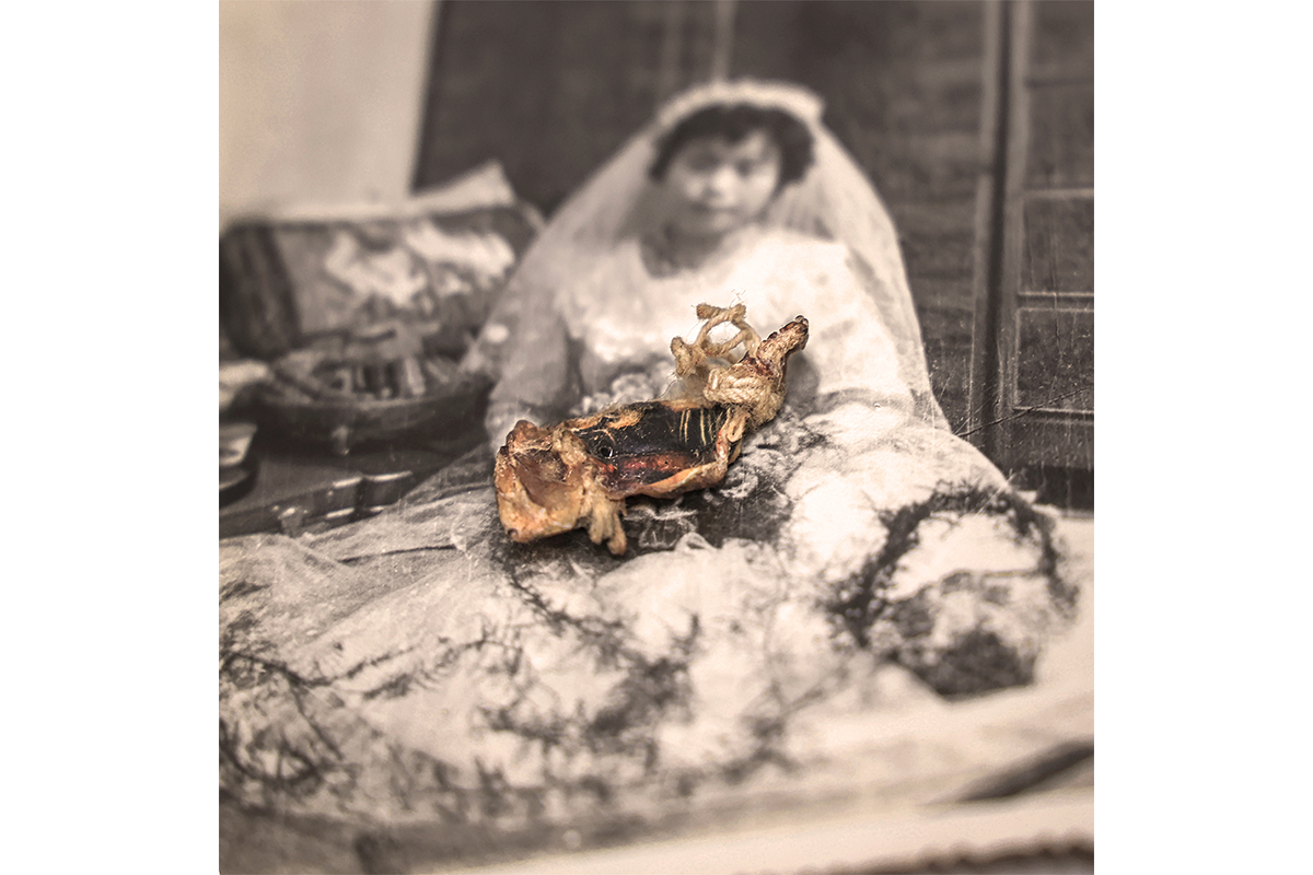 Cropping partial images from a single photo echoes the act of extracting an organ from the whole, a fragment from the body.