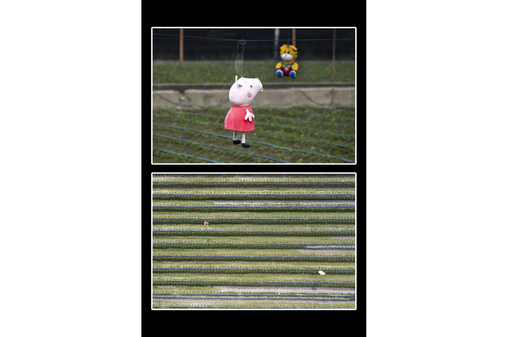 稻草人已經換装成布偶上場!在這幾畝田的舞台上,此起彼落地唱山歌。唱個什麼歌,頭上蜿蜒的線條,就是她抒發的曲調,時而悠揚,時而頓挫。