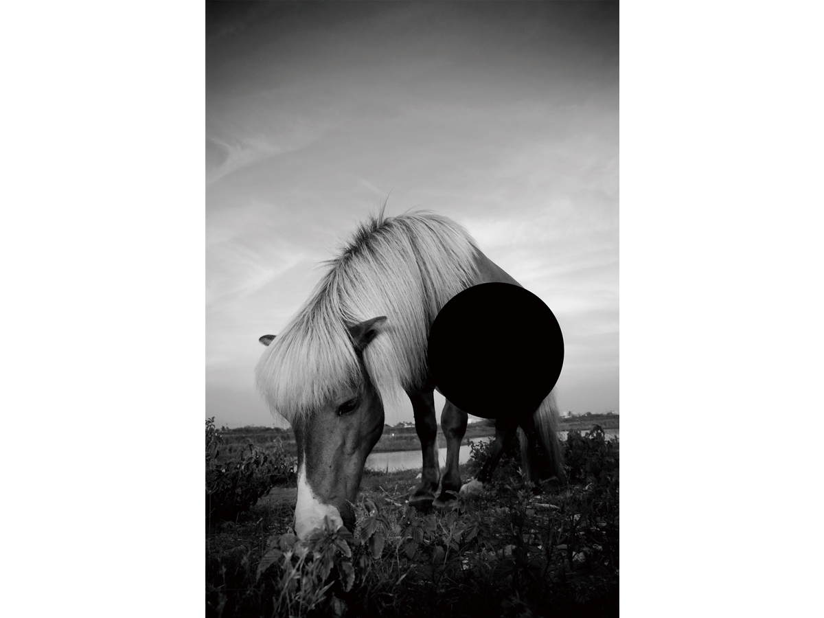 The result is a sublimely melancholy mood fed by the surreal black-and-white images of domesticated animals, which are the overt subject of the photos in this series, including the splendid yet bizarrely incongruous pony, the swamp creatures in a dense forest, and the lonely doves perching in a modern concrete jungle.