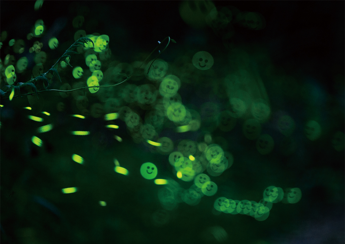 利用螢火蟲的螢光點配合上鏡頭前放置的”微笑”花式黑卡。讓螢光轉變成一種有趣的表情,營造出有趣生動的自然畫面。