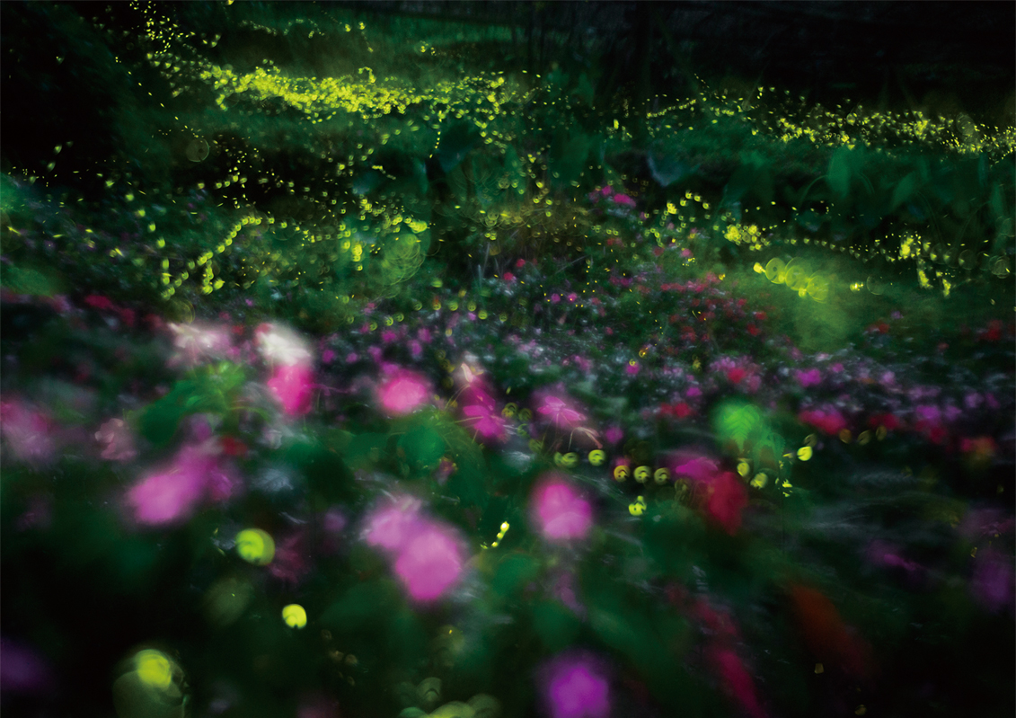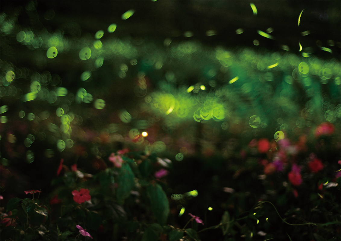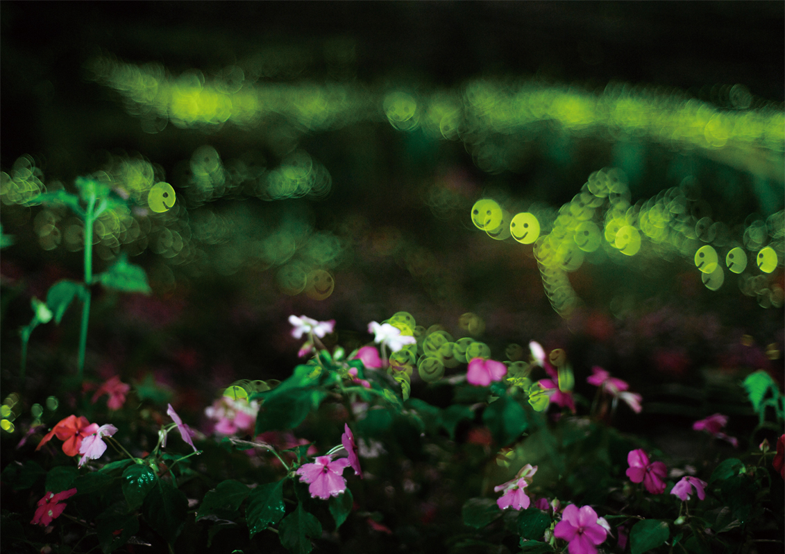 For this series of pictures, I put a “smiley face” black card in front of the lens and then focus on the dancing lights of fireflies, allowing the insects’ phosphorescent glow to make interesting shapes, and creating lively images of the nature.