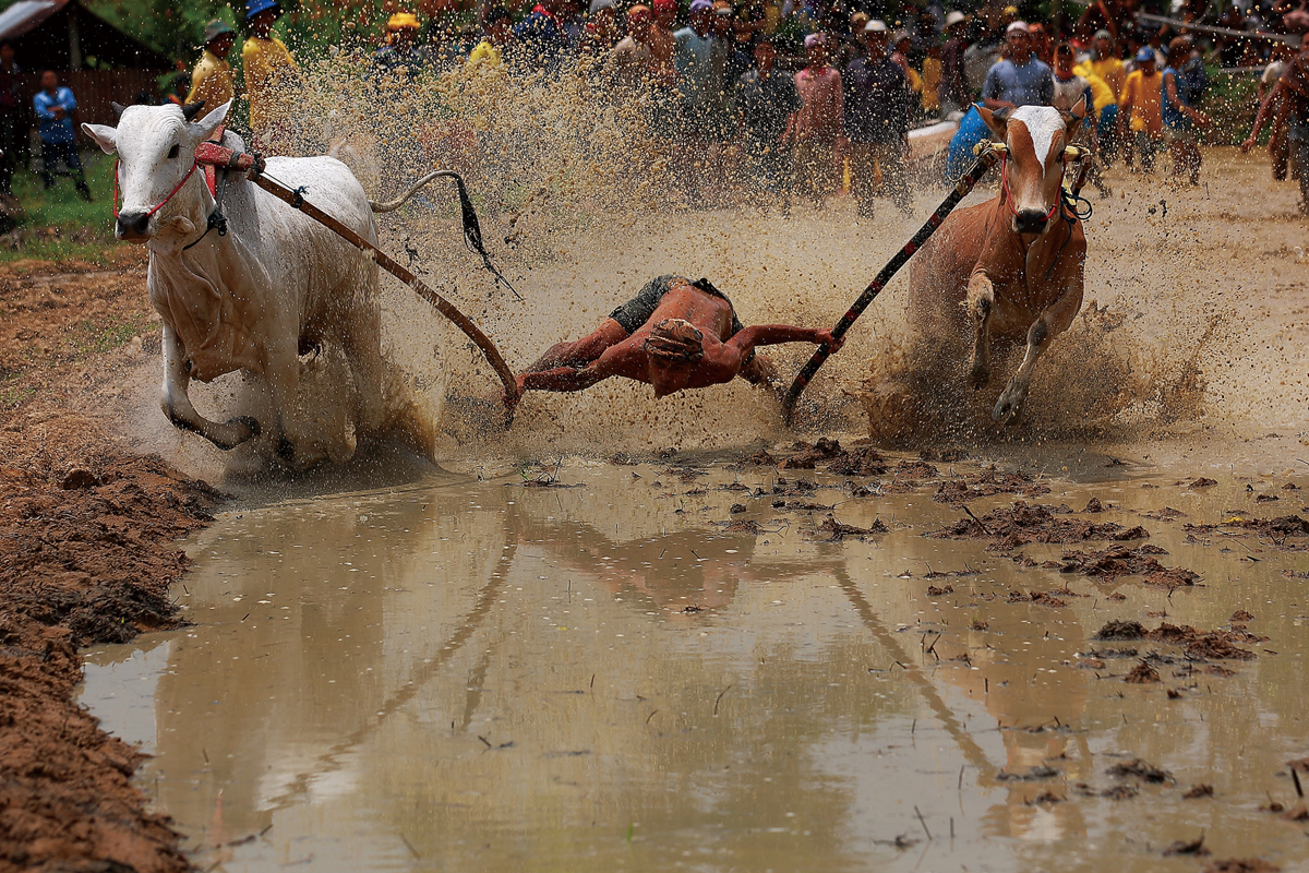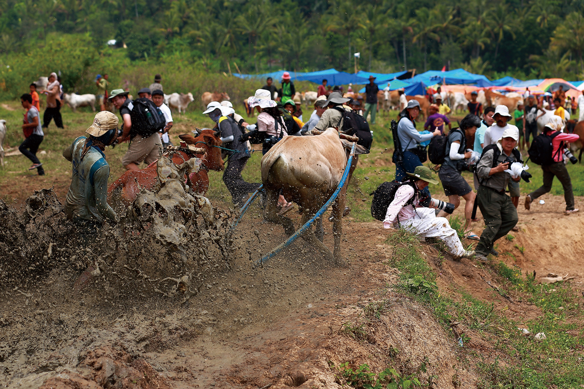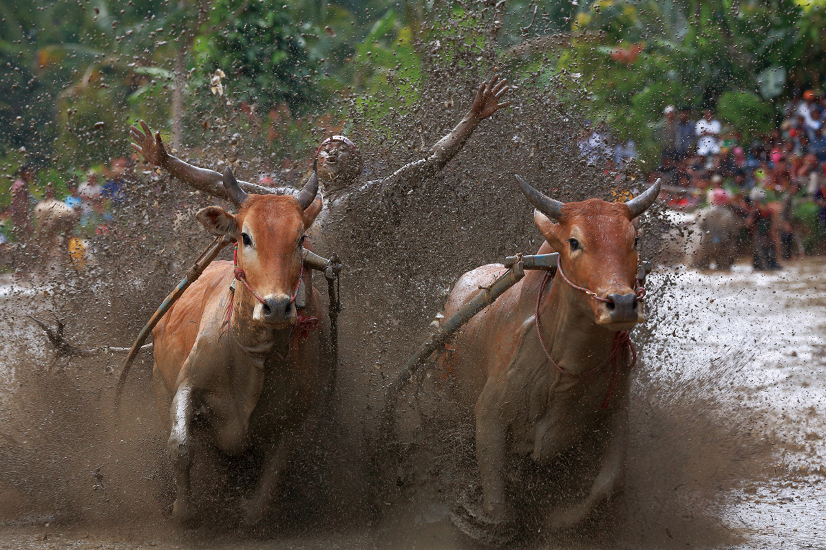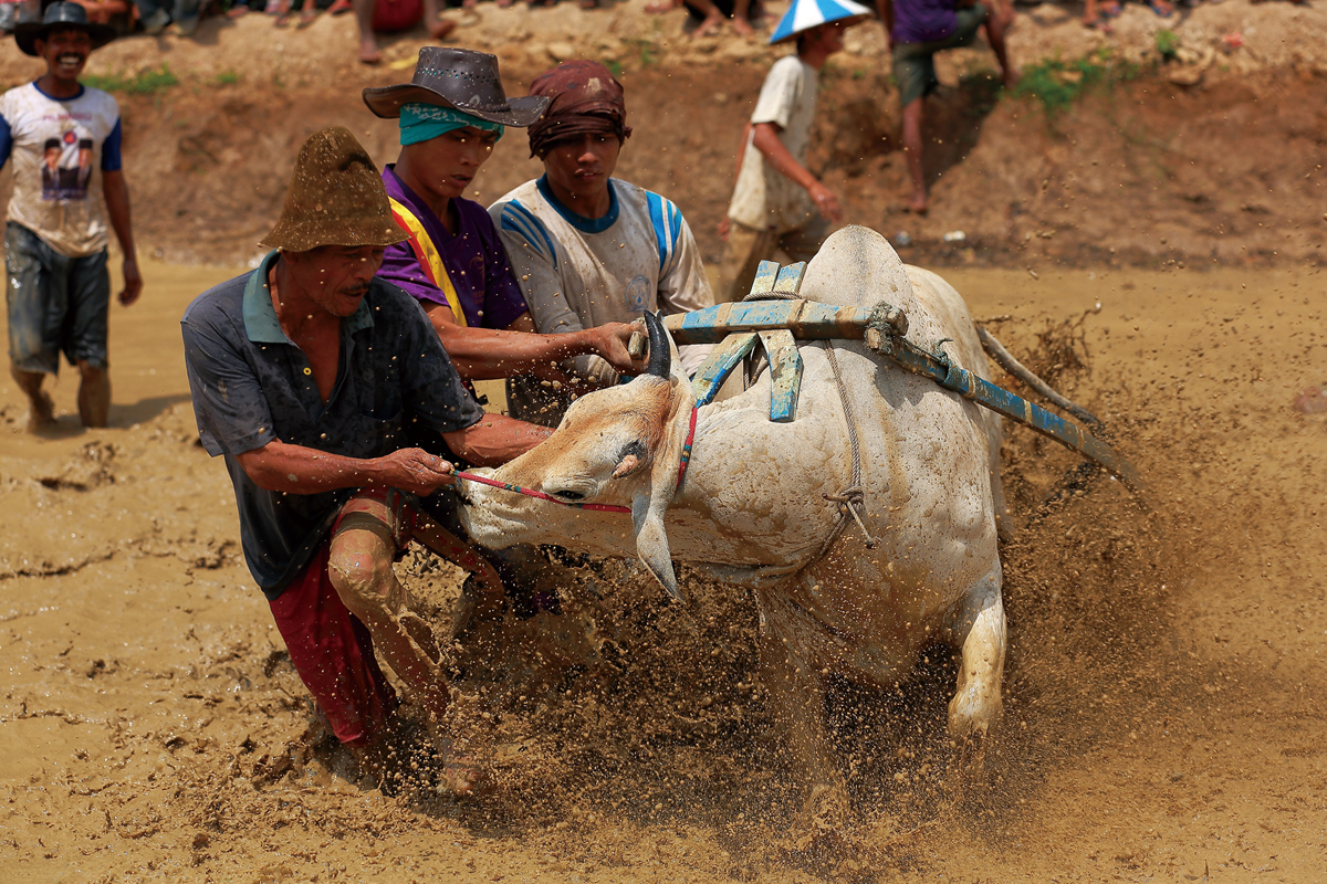 The Indonesian tradition of bull racing started in Sumatra with the history of hundreds of years. At first, it was a competition held by farmers after the harvest festival celebrations for entertaining the local people. In the contest, two bulls are bound together with a wooden yoke-like implement to form as a team, and several teams race against each other egged on from behind by their drivers. Since the races often take place on muddy terrain, the drivers are soon completely covered in mud. It is interesting to note that the fastest pair of bulls does not always win the race but the one which runs as straight as it can from the start to the finish line.