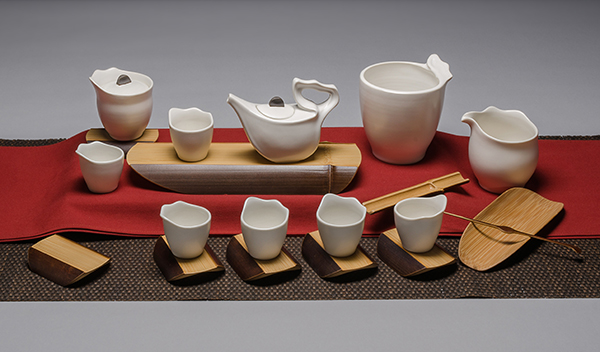 心向 / 雙鴻陶坊 代表人:朱啟章 作品以「心」為發想,傳達佛學中:「當下這念心清清楚楚、明明白白,看清每一個念頭中所包含的貪、瞋、癡,當下它就被照破,對外在環境不起攀緣染著,自內照而不昏沉無記是也。」作品以深色調的壺承襯扥杯緣的流線造型,呈現在竹林中隨風彿動的韻律,如流水般的線條柔軟而富力量,指引出「心之所向」,讓「茶器、茶湯、環境、人」成為互相串連且和諧的悠然空間。 尺寸:杯6×6×6cm、茶倉9×9×9cm、勻杯9×9×9cm、茶壺8×10×8cm、杯托9×7×2cm、水盂12×12×12cm、 材質:瓷土、竹 |