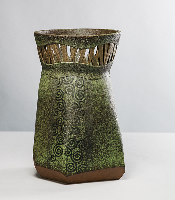 國人一般不會拿傘來當禮物餽贈,因傘有拆散、分離之意,反之,「聚散(傘)」則成為一個團圓的容器。作品以泥條成型,以化粧土裝飾圖樣,噴上泥漿釉,利用窯內氧化、還原並存的方法,讓釉色產生不同顏色與層次變化,成為一個置放家人與賓客的傘,把分散的親情和友情聚合在一起的溫暖傘桶。