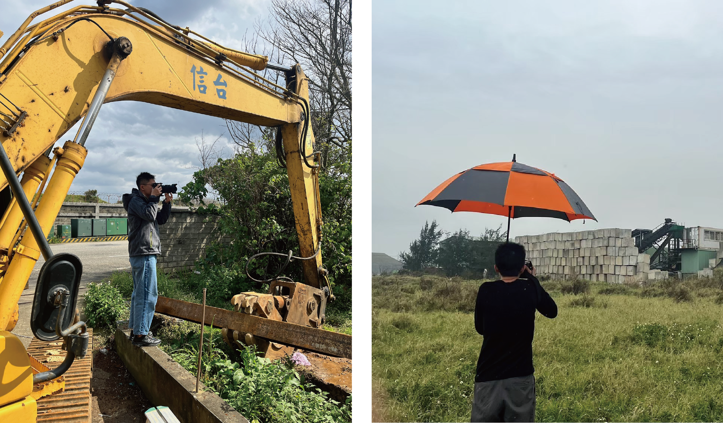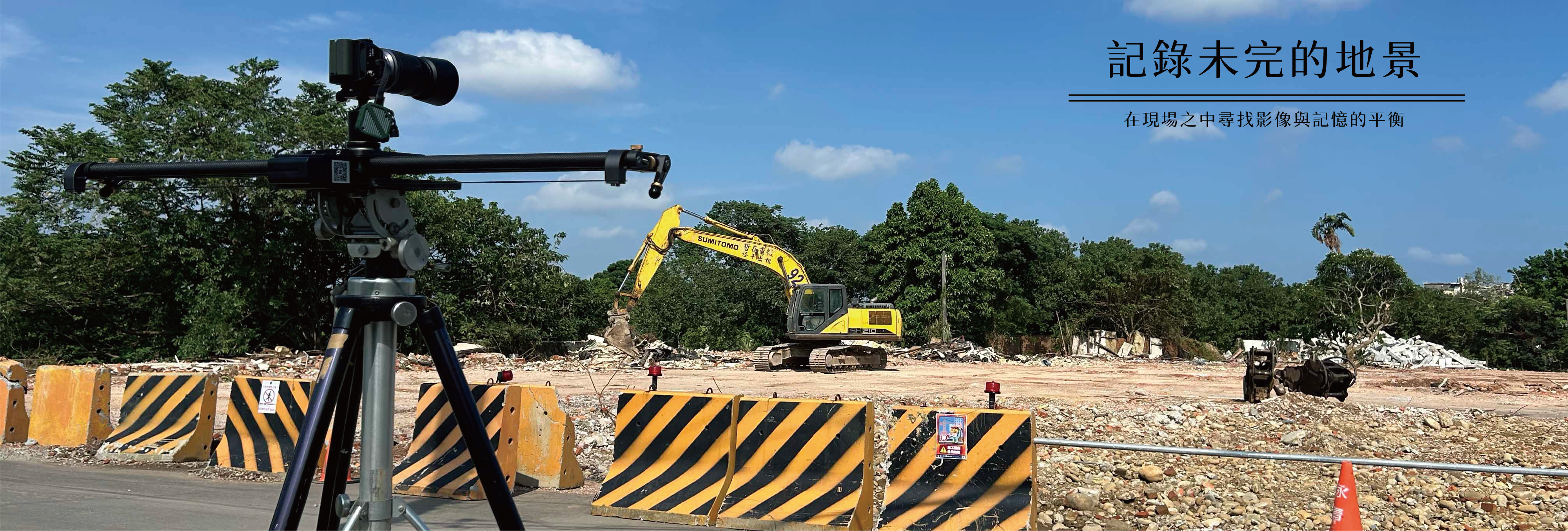 轉向施工現場與交界地景 隨著拍攝的深入,俊耀將鏡頭的焦點從被拆遷的村莊轉向「正在施工中的地景」,以及「被徵收與未徵收之間的交界區」。這些場域呈現出人類開發的真實狀態——碎裂、堆疊、重構,也映照出台灣都市化進程中最真切的現場感。他不再僅僅追尋消逝前的瞬間,而是觀察地景如何在重整與建構中不斷變形。為了呈現不同時間與氣候條件下的樣貌,俊耀在6月至7月間採取「同地點、不同天氣條件」的拍攝策略,試圖以時間為軸線,描繪航空城這片土地開發冗長的過程。